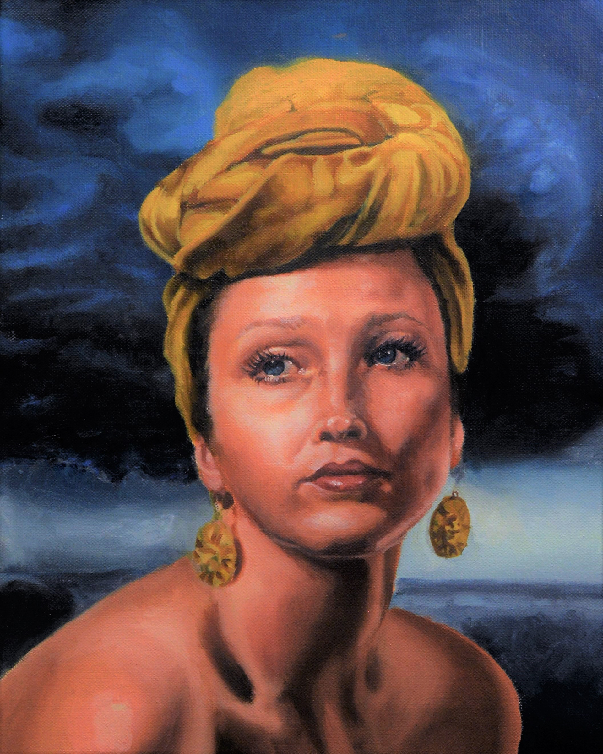 "Calm into the Storm" was inspired to give courage to those who have gone through a loss of a loved one or another tragic event. This painting shows an exaggerated situation contrasting the lady, dressed as the sun, and the storm. A huge storm, or loss of a loved one, is something that is out of our control and can be impossible to outrun. However, looking into the future and beyond the realm of the storm will give you strength and courage (also symbolized by the sun) to stand strong knowing that there are sunny days ahead.
